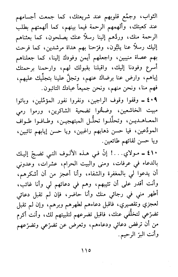 · مولاي .. ! إن في هذه الألوف التي تضجُّ إليك بالدعاء في عرفات، ومنى والبيت الحرام، عشرات، وعدوني أن يدعوا لي بالمغفرة والشفاء، وأنا أعجز من أن أشكرهم، وأنت أقدر على أن تثيبهم، وهم في دعائهم لي وأنا غائب، أطهر مني في رجائي منك وأنا حاضر، فإن لم تقبل دعائي لعجزي وتقصيري، فاقبل دعاءهم لطهرهم وبرهم، وإن لم تقبل تضرعي لتخلُّفي عنك، فاقبل تضرعهم لتلبيتهم لك، وأنت أكرم من أن ترفض دعائي ودعاءهم، وتعرض عن تضرُّعي وتضرُّعهم وأنت البرُّ الرحيم.