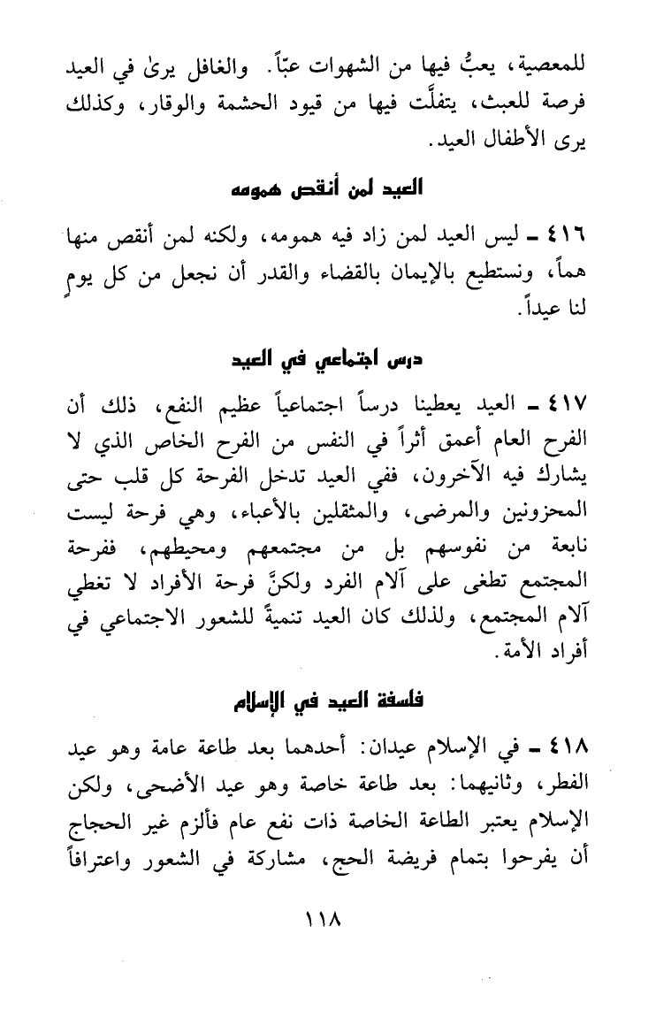 في الإسلام عيدان: أحدهما بعد طاعة عامة وهو عيد الفطر، وثانيهما: بعد طاعة خاصة وهو عيد الأضحى، ولكن الإسلام يعتبر الطاعة الخاصة ذات نفع عام؛ فألزم غير الحجاج أن يفرحوا بتمام فريضة الحج، مشاركة في الشعور، واعترافاً