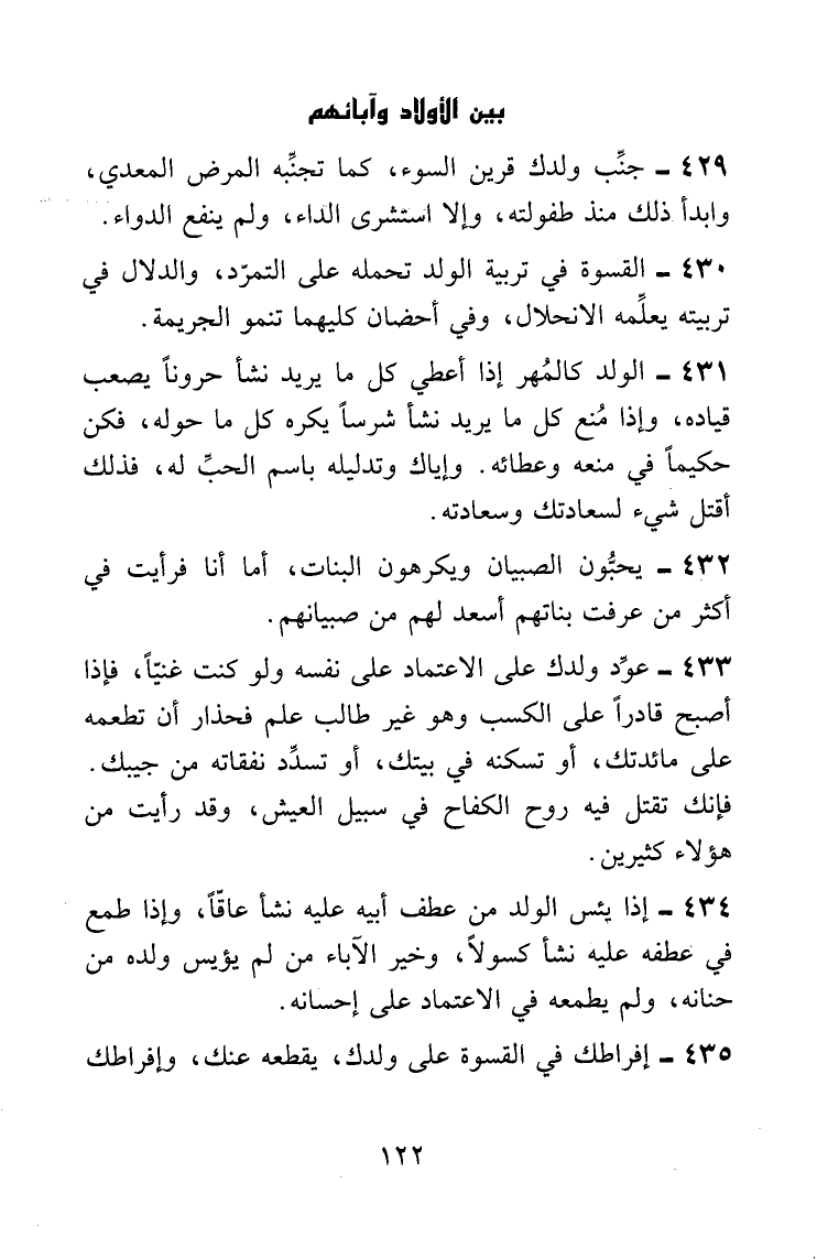 · عوِّد ولدك على الاعتماد على نفسه ولو كنت غنيًّا، فإذا أصبح قادراً على الكسب وهو غير طالب علم فحذار أن تطعمه على مائدتك، أو تسكنه في بيتك، أو تسدِّد نفقاته من جيبك. فإنك تقتل فيه روح الكفاح في سبيل العيش، وقد رأيت من هؤلاء كثير.