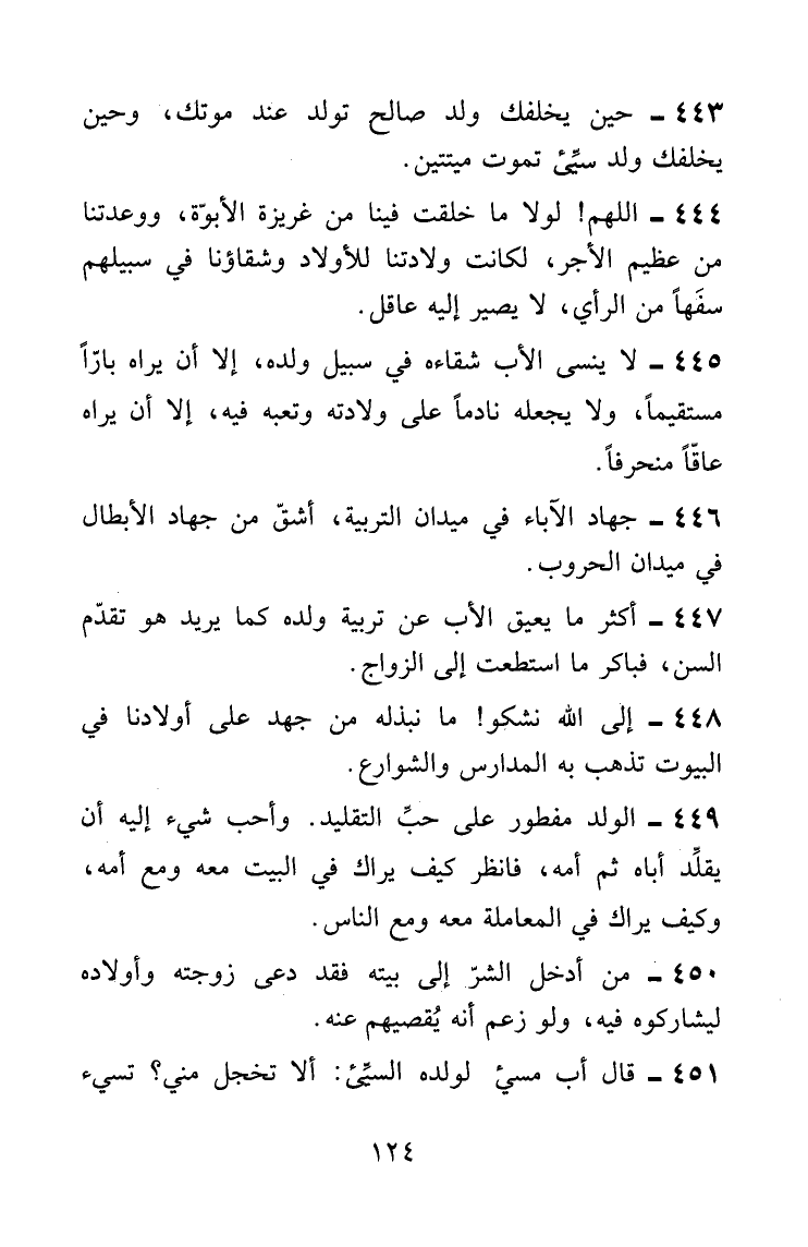 · لا ينسى الأب شقاءه في سبيل ولده، إلا أن يراه بارًّا مستقيماً، ولا يجعله نادماً على ولادته وتعبه فيه، إلا أن يراه عاقًّا منحرفاً.