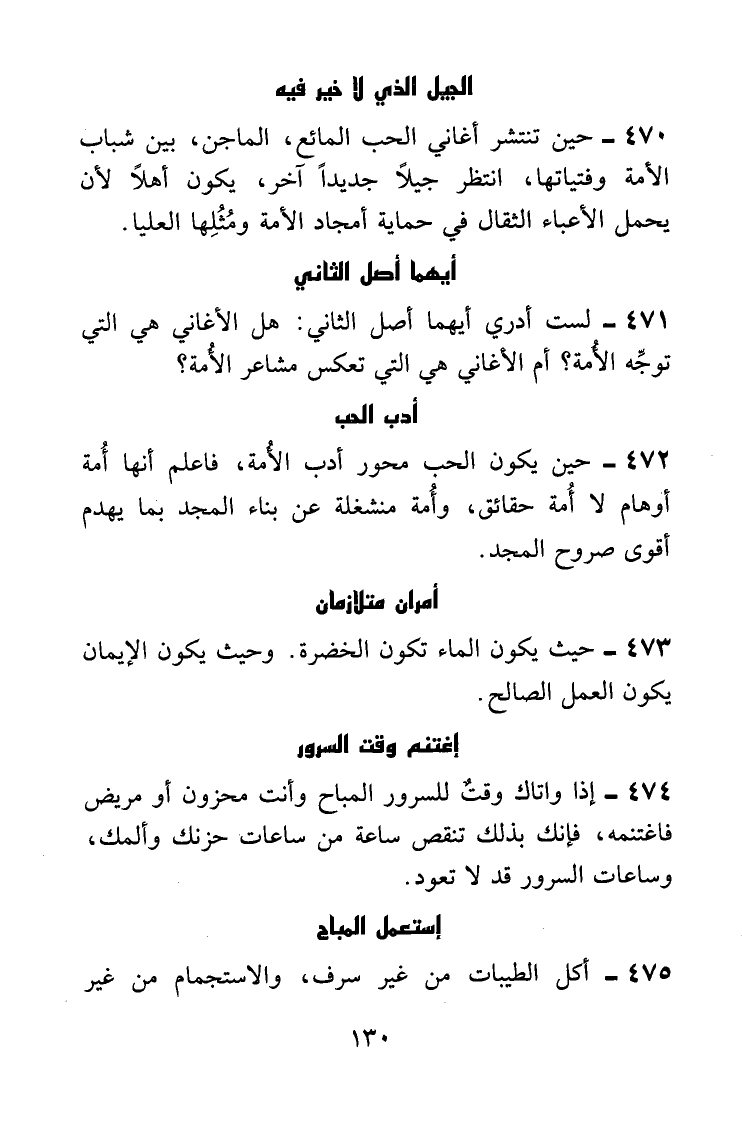 حين تنتشر أغاني الحب المائع، الماجن، بين شباب الأمة وفتياتها، انتظر جيلاً جديداً آخر، يكون أهلاً لأن يحمل الأعباء الثقال في حماية أمجاد الأمة ومثلها العليا.