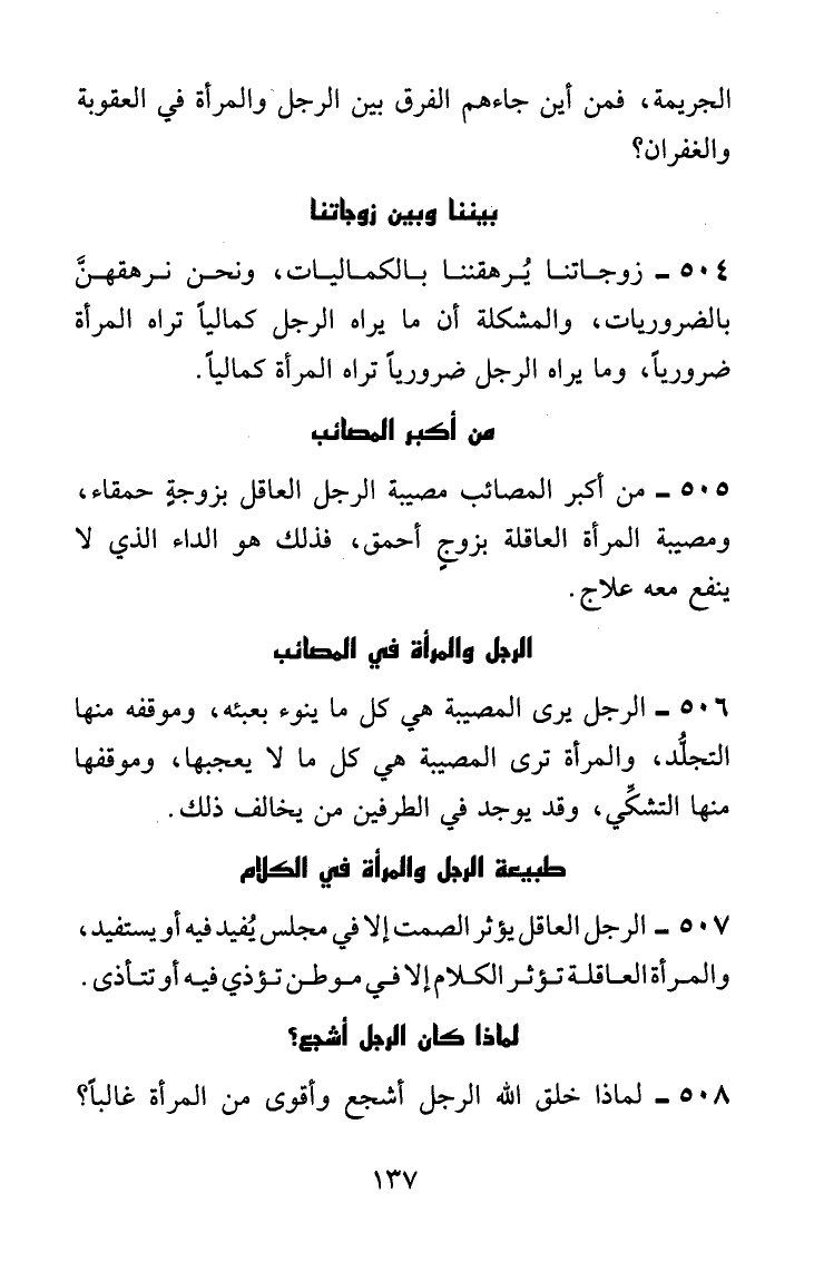 زوجاتنا يرهقننا بالكماليات، ونحن نرهقهنَّ بالضروريات، والمشكلة أن ما يراه الرجل كماليًّا تراه المرأة ضروريًّا، وما يراه الرجل ضروريًّا تراه المرأة كماليًّا.