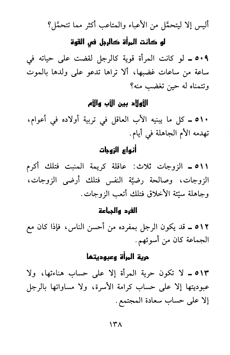 لا تكون حرية المرأة إلا على حساب هناءتها، ولا عبوديَّتها إلا على حساب كرامة الأسرة، ولا مساواتها بالرجل إلا على حساب سعادة المجتمع.