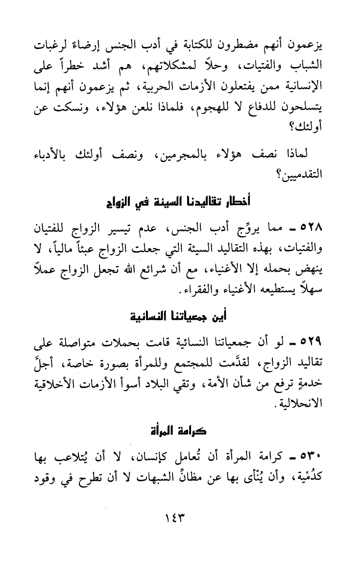 يزعمون أنهم مضطرون للكتابة في أدب الجنس إرضاء لرغبات الشباب والفتيات، وحلاًّ لمشكلاتهم، هم أشد خطراً على الإنسانية ممن يفتعلون الأزمات الحربية ثم يزعمون أنهم إنما يتسلحون للدفاع لا للهجوم، فلماذا نلعن هؤلاء، ونسكت عن أولئلك؟.