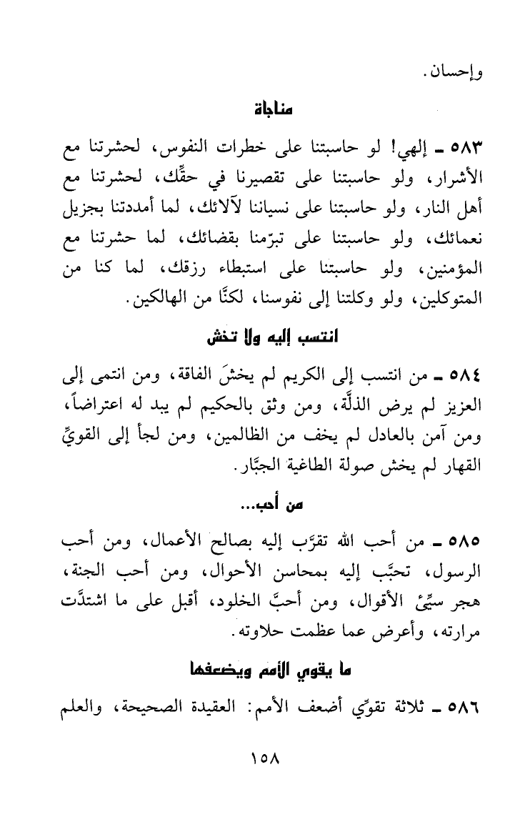 إلهي! لو حاسبتنا على خطرات النفوس، لحشرتنا مع الأشرار، ولو حاسبتنا على تقصيرنا في حقِّك، لحشرتنا مع أهل النار، ولو حاسبتنا على نسياننا لآلائك، لما أمددتنا بجزيل نعمائك، ولو حاسبتنا على تبرُّمنا بقضائك، لما حشرتنا مع المؤمنين، ولو حاسبتنا على استبطاء رزقك، لما كنا من المتوكلين، ولو ركلتنا إلى نفوسنا، لكنَّا من الهالكين.