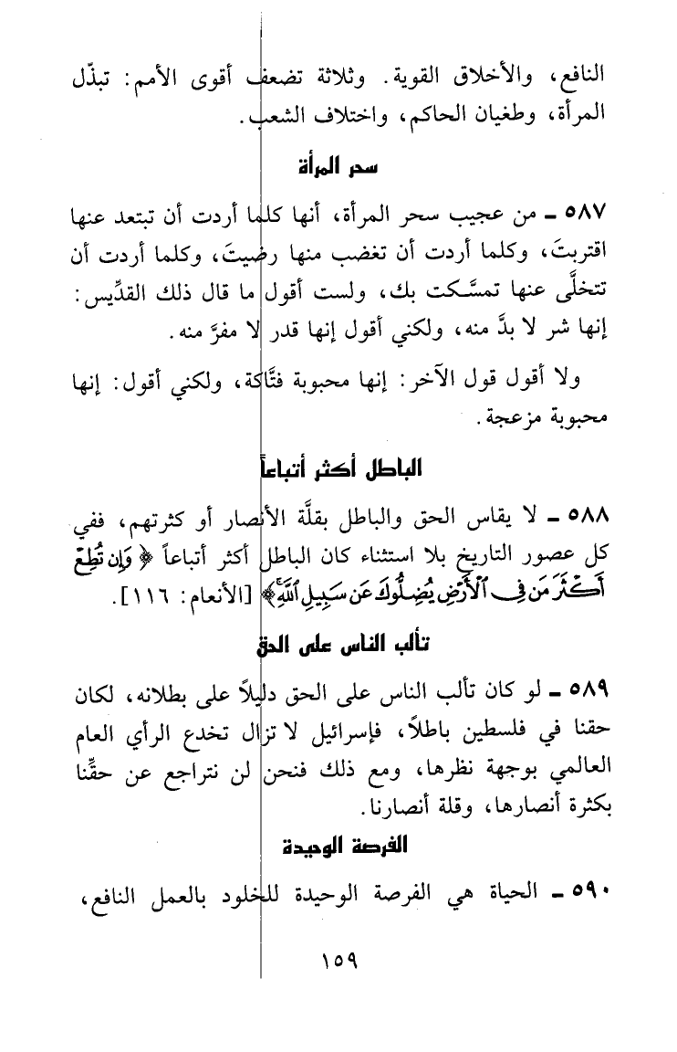 من عجيب سحر المرأة، أنها كلما أردت أن تبتعد عنها اقتربت، وكلما أردت أن تغضب منها رضيت، وكلما أردت أن تتخلَّى عنها تمسَّكت بك، ولست أقول ما قال ذلك القدِّيس: إنها شر لا بد منه، ولكني أقول إنها قدر لا مفرّ منه.