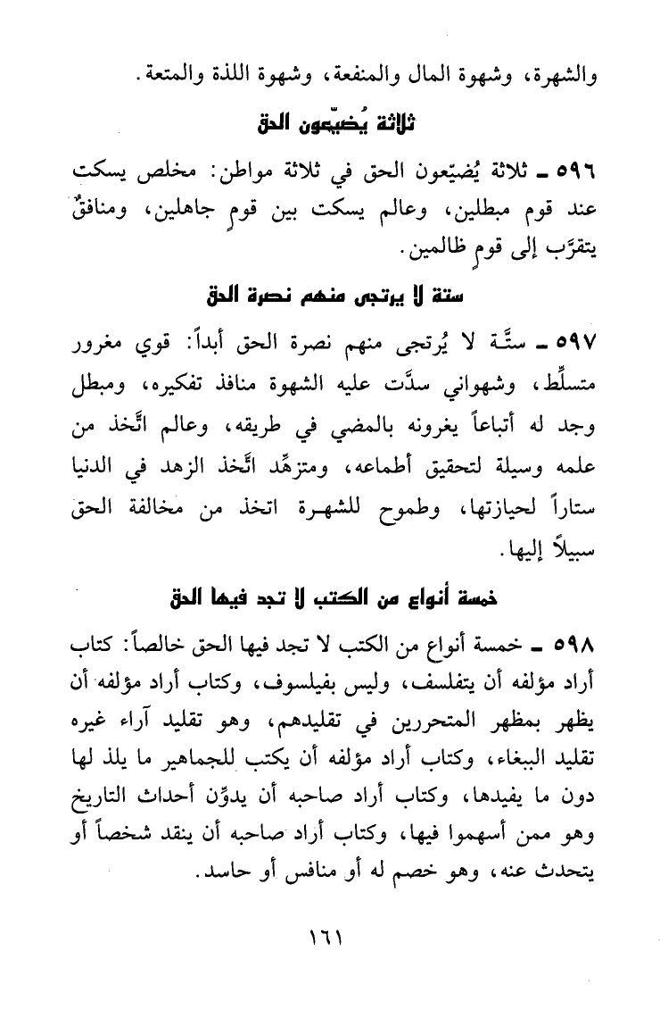 خمسة كتب لا تجد فيها الحق خالصاً: كتاب أراد مؤلفه أن يتفلسف وليس بفيلسوف، وكتاب أراد مؤلفه أن يظهر بمظهر المتحررين في تفكيرهم، وهو يقلد آراء غيره تقليد الببغاء، وكتاب أراد مؤلفه أن يكتب للجماهير ما يلذ لها دون ما يفيدها، وكتاب أراد صاحبه أن يدوِّن أحداث التاريخ وهو ممن أسهموا فيها، وكتاب أراد صاحبه أن ينقد شخصاً أو يتحدث عنه، وهو خصم له أو منافس أو حاسد.
