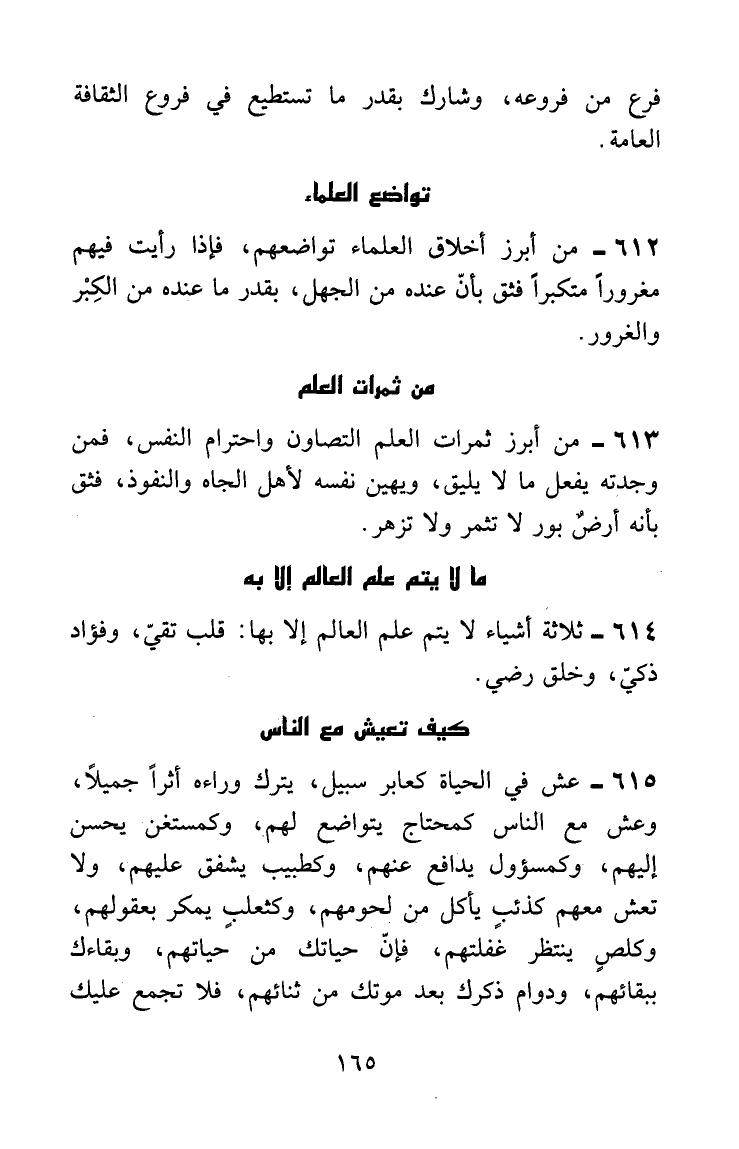 عش في الحياة كعابر سبيل يترك وراءه أثراً جميلاً، وعش مع الناس كمحتاج يتواضع لهم، وكمستغن يحسن إليهم، وكمسؤول يدافع عنهم، وكطبيب يشفق عليهم، ولا تعش معهم كذئب يأكل من لحومهم، وكثعلب يمكر بعقولهم، وكلص ينتظر غفلتهم؛ فإن حياتك من حياتهم، وبقاءك ببقائهم، ودوام ذكرك بعد موتك من ثنائهم، فلا تجمع عليك