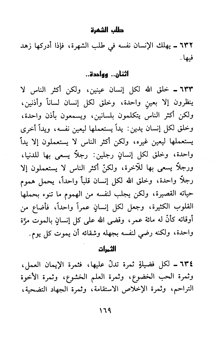 خلق الله لكل إنسان عينين، ولكن أكثر الناس لا ينظرون إلا بعين واحدة، وخلق لكل إنسان لساناً وأذنين، ولكن أكثر الناس يتكلمون بلسانين، ويسمعون بأذن واحدة، وخلق لكل إنسان يدين: يداً يستعملها ليعين نفسه، ويداً أخرى يستعملها ليعين غيره، ولكن أكثر الناس لا يستعملون إلا يداً واحدة، وخلق لكل إنسان رجلين: رجلاً يسعى بها للدنيا، ورجلاً يسعى بها للآخرة، ولكن أكثر الناس لا يستعملون إلا رجلاً واحدة، وخلق الله لكل إنسان قلباً واحداً، يحمل هموم حياته القصيرة، ولكن يجلب لنفسه من الهموم ما تنوء بحملها القلوب الكثيرة، وجعل لكل إنسان عمراً واحداً، فأضاع من أوقاته كأن له مائة عمر، وقضى الله على كل إنسان بالموت مرة واحدة، ولكنه رضي لنفسه بجهله وشقائه أن يموت كل يوم.