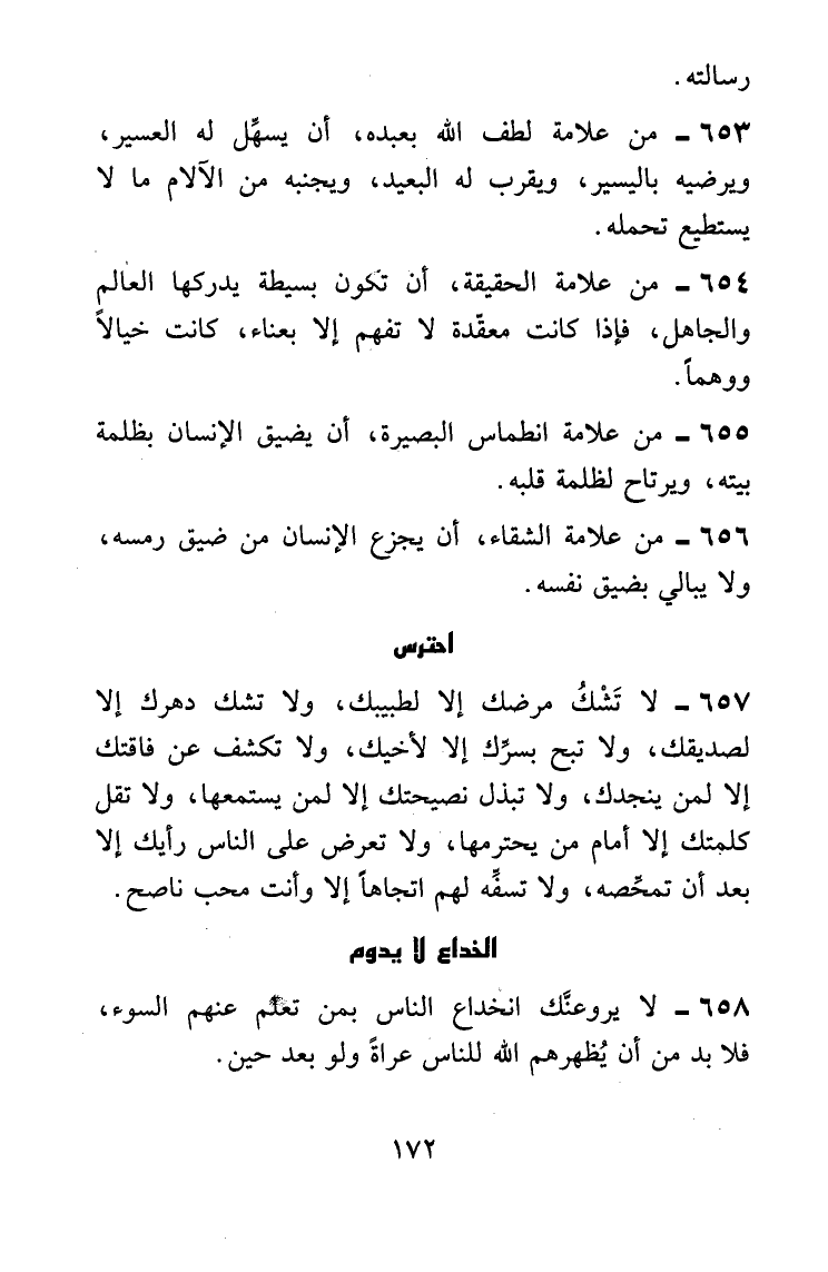 لا تشك مرضك إلا لطبيبك، ولا تشك دهرك إلا لصديقك، ولا تبح بسرك إلا لأخيك، ولا تكشف عن فاقتك إلا لمن ينجدك، ولا تبذل نصيحتك إلا لمن يستمعها، ولا تقل كلمتك إلا أمام من يحترمها، ولا تعرض على الناس رأيك إلا بعد أن تمحِّصه، ولا تسفه لهم اتجاهاً إلا وأنت محب ناصح.