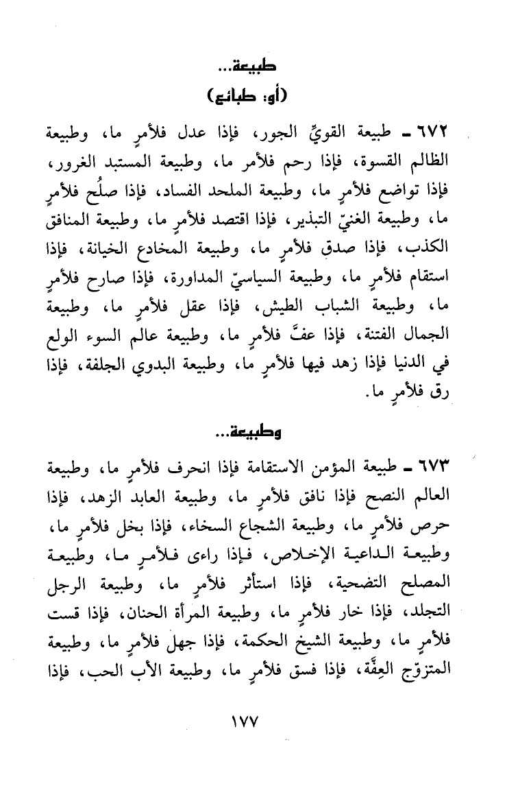 طبيعة القوي الجور، فإذا عدل فلأمر ما، وطبيعة الظالم القسوة، فإذا رحم فلأمر ما، وطبيعة المستبد الغرور، فإذا تواضع فلأمر ما، وطبيعة الملحد الفساد، فإذا صلح فلأمر ما، وطبيعة الغني التبذير، فإذا اقتصد فلأمر ما، وطبيعة المنافق الكذب، فإذا صدق فلأمر ما، وطبيعة المخادع الخيانة، فإذا استقام فلأمر ما، وطبيعة السياسي المداورة، فإذا صارح فلأمر ما، وطبيعة الشباب الطيش، فإذا عقل فلأمر ما، وطبيعة الجمال الفتنة، فإذا عف فلأمر ما، وطبيعة عالم السوء الولع في الدنيا، فإذا زهد فيها فلأمر ما، وطبيعة البدوي الجلفة، فإذا رق فلأمر ما.