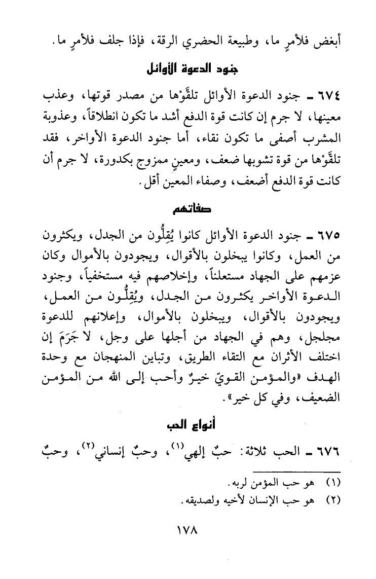 جنود الدعوة الأوائل كانوا يقلون من الجدل، ويكثرون من العمل، وكانوا يبخلون بالأقوال، ويجودون بالأموال، وكان عزمهم على الجهاد مستعلناً، وإخلاصهم فيه مستخفياً. وجنود الدعوة الأواخر يكثرون من الجدل، ويقلون من العمل، ويجودون بالأقوال، ويبخلون بالأموال، وإعلانهم للدعوة مجلجل، وهم في الجهاد من أجلها على وجل، لا جرم إن اختلف الأثران مع التقاء الطريق، وتباين المنهجان مع وحدة الهدف "والمؤمن القوي خير وأحب إلى الله من المؤمن الضعيف، وفي كل خير".