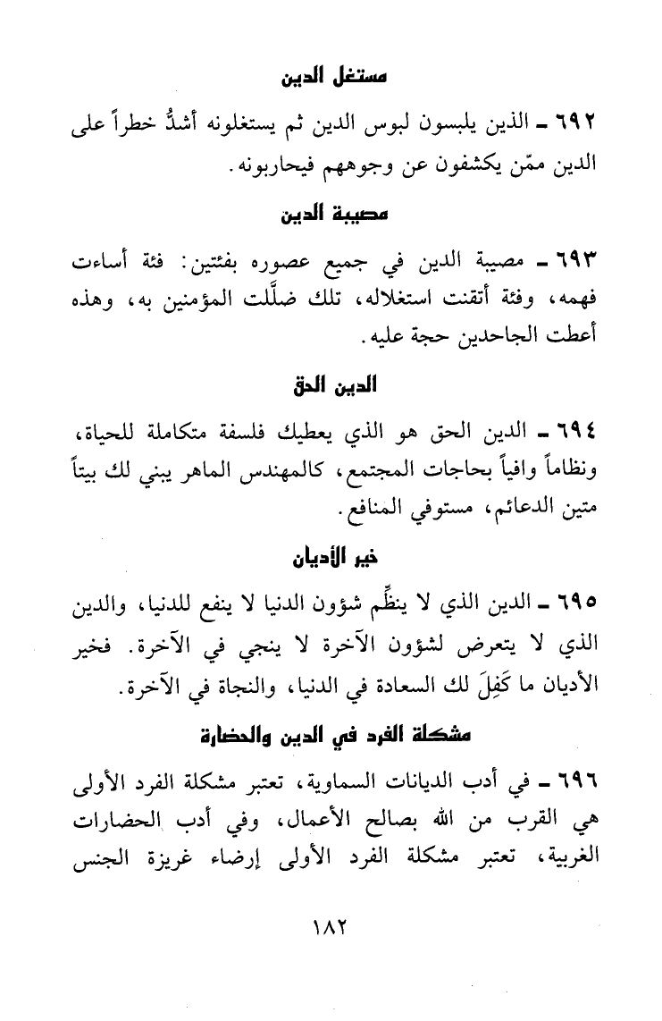الدين الحق هو الذي يعطيك فلسفة متكاملة للحياة، ونظاماً وافياً بحاجات المجتمع، كالمهندس الماهر يبني لك بيتاً متين الدعائم، مستوفي المنافع.