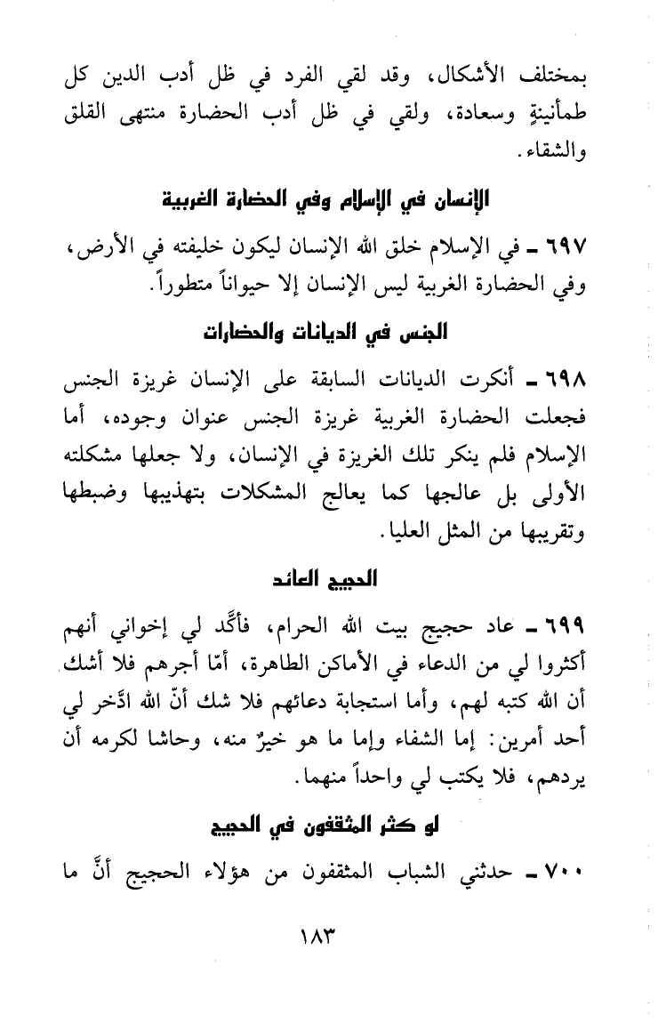 بمختلف الأشكال، وقد لقي الفرد في ظل أدب الدين كل طمأنينة وسعادة، ولقي في ظل أدب الحضارة منتهى القلق والشقاء.