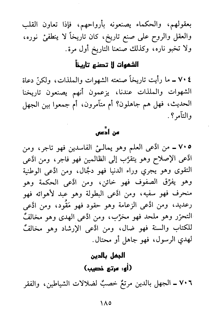 من ادَّعى العلم وهو يمالئ الفاسدين فهو تاجر، ومن ادعى الإصلاح وهو يتقرَّب إلى الظالمين فهو فاجر، ومن ادَّعى التقوى وهو يجري وراء الدنيا فهو دجَّال، ومن ادَّعى الوطنية وهو يفرِّق الصفوف فهو خائن، ومن ادَّعى الحكمة وهو منحرف فهو سفيه، ومن ادَّعى البطولة وهو عبد لأهوائه فهو رعديد. ومن ادَّعى الزعامة وهو حقود فهو مقود، ومن ادَّعى التحرُّر وهو ملحد فهو مخرِّب، ومن ادَّعى الهدى وهو مخالف للكتاب والسنة فهو ضال، ومن ادَّعى الإرشاد وهو مخالف لهدي الرسول صلى الله عليه وسلم، فهو جاهل أو محتال.