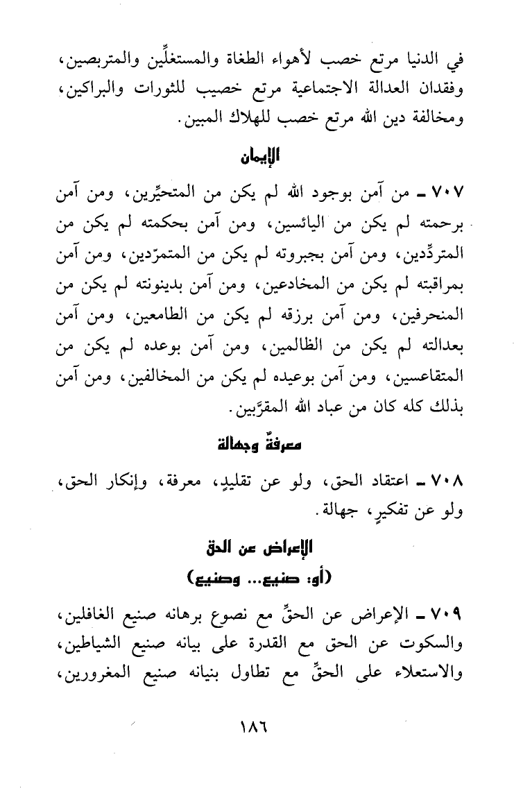 الإعراض عن الحقِّ مع نصوع برهانه صنيع الغافلين، والسكوت عن الحق مع القدرة على بيانه صنيع الشياطين، والاستعلاء على الحقِّ مع تطاول بنيانه صنيع المغرورين،
