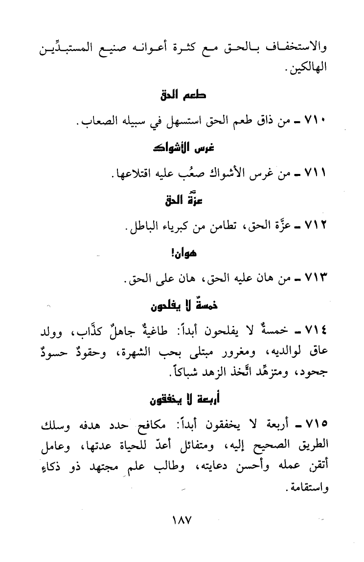 خمسة لا يفلحون أبداً: طاغية جاهل كذاب، وولد عاق لوالديه، ومغرور مبتلى بحب الشهرة، وحقود حسود حجود، ومتزهِّد اتخذ الزهد شباكاً.