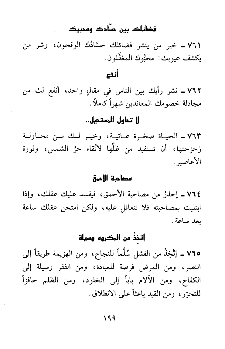 اتّخذ من الفشل سلَّماً للنجاح، ومن الهزيمة طريقاً إلى النصر، ومن المرض فرصة للعابدة، ومن الفقر وسيلة إلى الكفاح، ومن الآلام باباً إلى الخلود، ومن الظلم حافزاً للتحرُّر، ومن القيد باعثاً على الانطلاق.