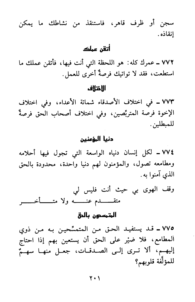 لكل إنسان دنياه الواسعة التي تجول فيها أحلامه ومطامعه تصول، والمؤمنون لهم دنيا واحدة محدودة بالحق الذي آمنوا به.