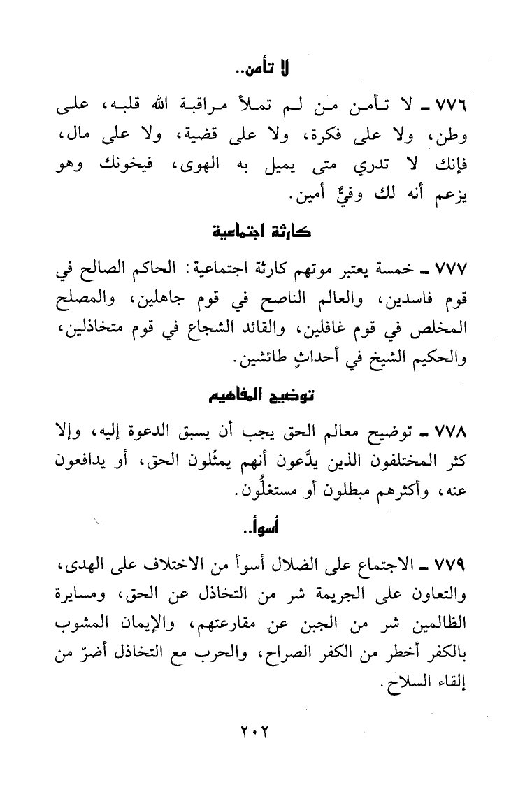 الاجتماع على الضلال أسوأ من الاختلاف على الهدى، والتعاون على الجريمة شرٌّ من التخاذل عن الحق، ومسايرة الظالمين شر من الجبن عن مقارعتهم، والإيمان المشوب بالكفر أخطر من الكفر الصراح، والحرب مع التخاذل أضرُّ من إلقاء السلاح.