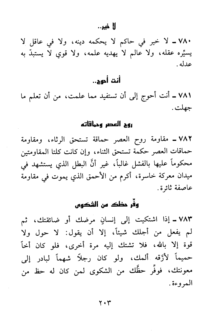 إذا اشتكيت إلى إنسان مرضك أو ضائقتك، ثم لم يفعل من أجلك شيئاً، إلا أن يقول: لا حول ولا قوة إلا بالله، فلا تشتكِ إليه مرة أخرى، فلو كان أخاً حميماً لأرَّقه ألمك، ولو كان رجلاً شهماً لبادر إلى معونتك، فوفِّر حظَّك من الشكوى لمن كان له حظ من المروءة.