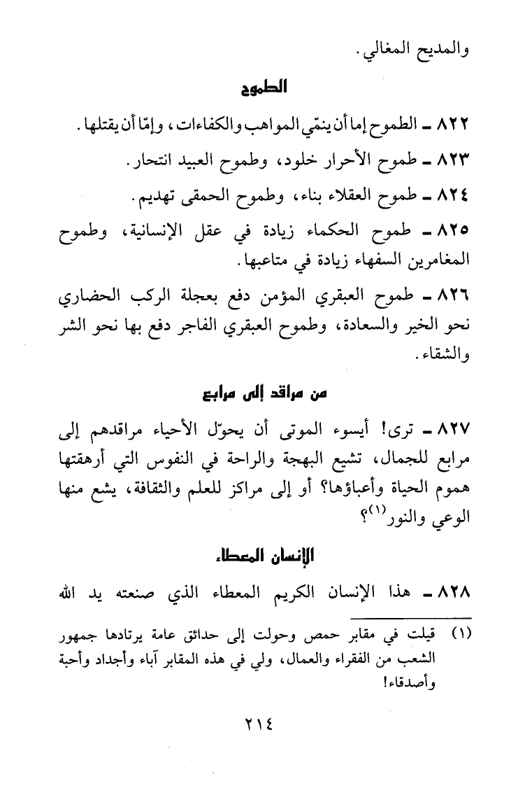 ترى! أيسوء الموتى أن يحوِّل الأحياء مراقدهم إلى مرابع للجمال، تشيع البهجة والراحة في النفوس التي أرهقتها هموم الحياة وأعباؤها؟ أو إلى مراكز للعلم والثقافة، يشع منها الوعي والنور؟ (قيلت في مقابر حمص، وحولت إلى حدائق عامة يرتادها جمهور الشعب من الفقراء والعمال، ولي في هذه المقابر آباء وأجداد وأحبة وأصدقاء!)