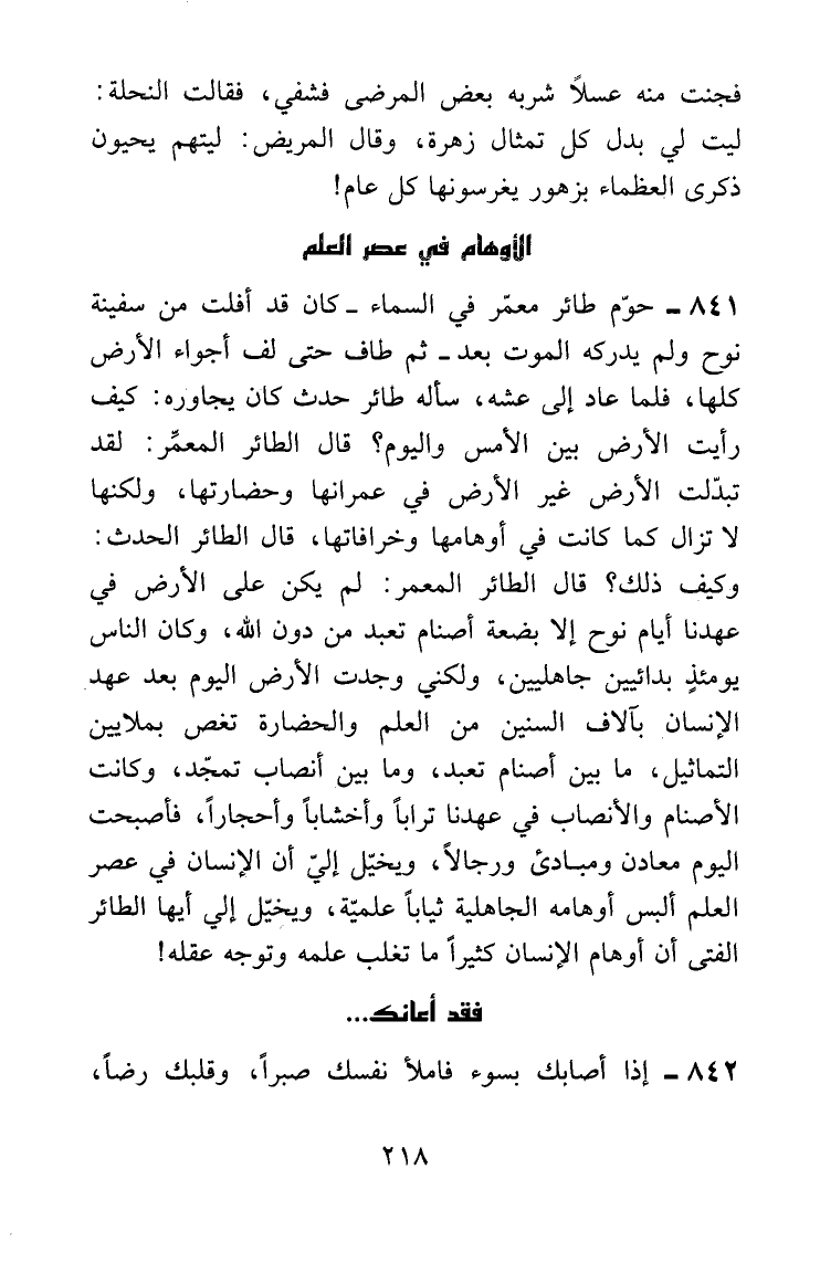 حوَّم طائر معمر في السماء - كان قد أفلت من سفينة نوح ولم يدركه الموت بعد - ثم طاف حتى لف أجواء الأرض كلها، فلما عاد إلى عشه، سأله طائر حدث كان يحاوره: كيف رأيت الأرض بين الأمس واليوم؟ قال الطائر المعمر: لقد تبدلت الأرض غير الأرض في عمرانها وحضارتها، ولكنها لا تزال كما كانت في أوهامها وخرافاتها، قال الطائر الحدث: وكيف ذلك؟ قال الطائر المعمر: لم يكن على الأرض في عهدنا أيام نوح إلا بضعة أصنام تعبد من دون الله، وكان الناس يومئذ بدائيين جاهليين، ولكني وجدت الأرض اليوم بعد عهد الإنسان بآلاف السنين من العلم والحضارة تغص بملايين التماثيل، ما بين أصنام تُعبد، وما بين أنصاب تُمجد، وكانت الأصنام والأنصاب في عهدنا تراباً وأخشاباً وأخجاراً، فأصبحت اليوم معادن ومبادئ ورجالاً، ويخيل إليَّ أن الإنسان في عصر العلم ألبس أوهامه الجاهلية ثياباً علمية، ويخيل إليَّ أيها الطائر الفتى أن أوهام الإنسان كثيراً ما تغلب على علمه وتوجه عقله!