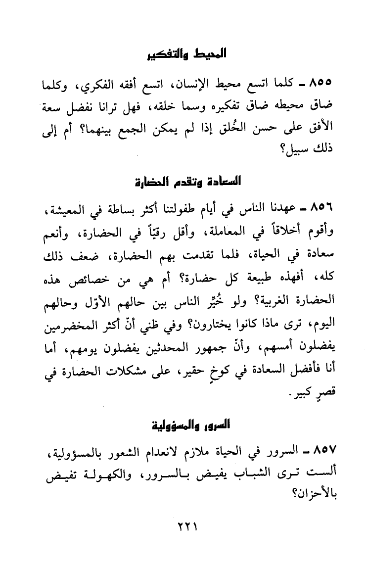 عهدنا الناس في أيام طفولتنا أكثر بساطة في المعيشة، وأقوم أخلاقاً في المعاملة، وأقل رقيًّا في الحضارة، وأنعم سعادة في الحياة، فلما تقدمت بهم الحضارة، ضعف ذلك كله، أفهذه طبيعة كل حضارة؟ أم هي من خصائص هذه الحضارة الغربية؟ ولو خير الناس بين حالهم الأول وحالهم اليوم، ترى ماذا كانوا يختارون؟ وفي ظني أن أكثر المخضرمين يفضلون أمسهم، وأن جمهور المحدثين يفضلون يومهم، أما أنا فأفضل السعادة في كوخ حقير على مشكلات الحضارة في قصر كبير.