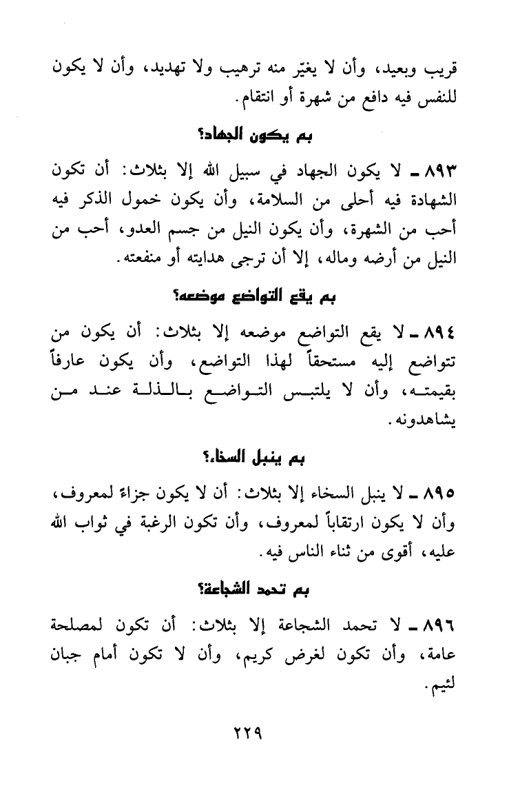 لا يكون الجهاد في سبيل الله إلا بثلاث: أن تكون الشهادة فيه أحلى من السلامة، وأن يكون خمول الذكر فيه أحب من الشهرة، وأن يكون النيل من جسم العدو أحب من النيل من أرضه وماله؛ إلا أن ترجى هدايته أو منفعته.