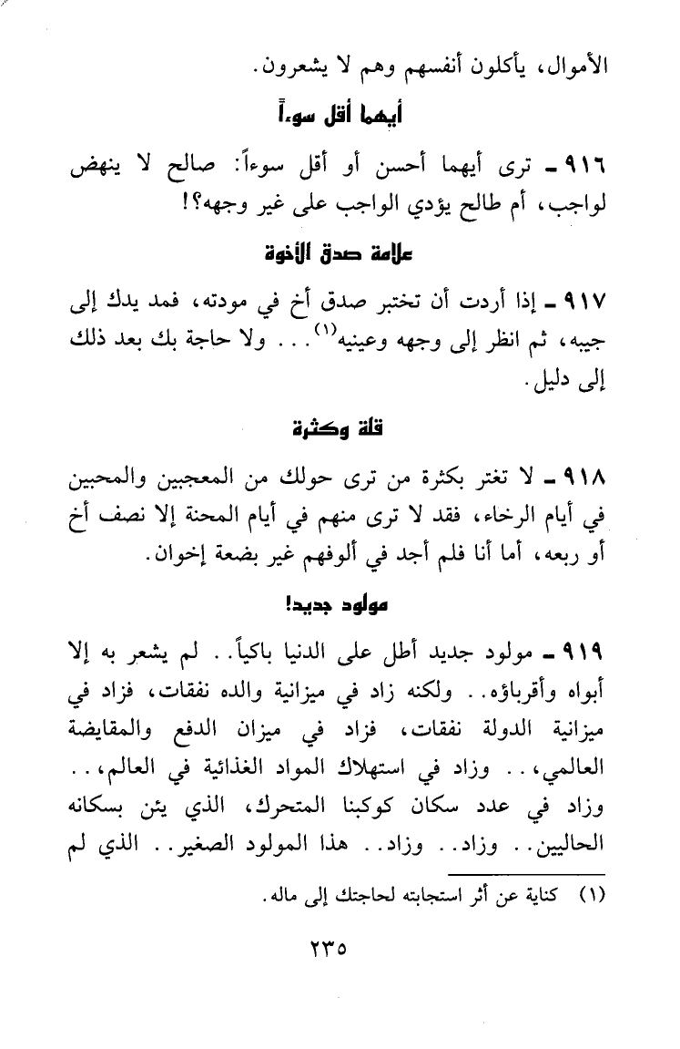 مولود جديد أطل على الدنيا باكياً .. لم يشعر به إلا أبواه وأقرباؤه .. ولكنه زاد في ميزانية والده نفقات، فزاد في ميزانية الدولة نفقات، فزاد في ميزان الدفع والمقايضة العالمي، .. وزاد في استهلاك المواد الغذائية في العالم، .. وزاد في عدد سكان كوكبنا المتحرك، الذي يئن بسكانه الحاليين ... وزاد .. وزاد .. هذا المولود الصغير .. الذي لم