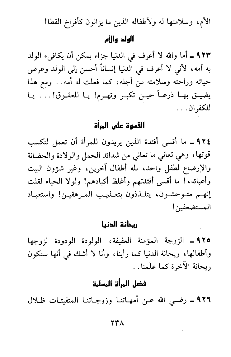 أما والله لا أعرف في الدنيا جزاء يمكن أن يكافئ الولد به أمه، لأني لا أعرف في الدنيا إنساناً أحسن إلى الولد وعرض حياته وراحته وسلامته من أجله، كما فعلت له أمه .. ومع هذا يضيق بها ذرعاً حين تكبر وتهرم! يا للعقوق! .. يا للكفران.