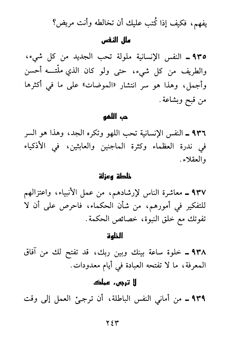 معاشرة الناس لإرشادهم، من عمل الأنبياء، واعتزالهم للتفكير في أمورهم، من شأن الحكماء، فاحرص على أن لا تفوتك مع خلق النبوة خصائص الحكمة.