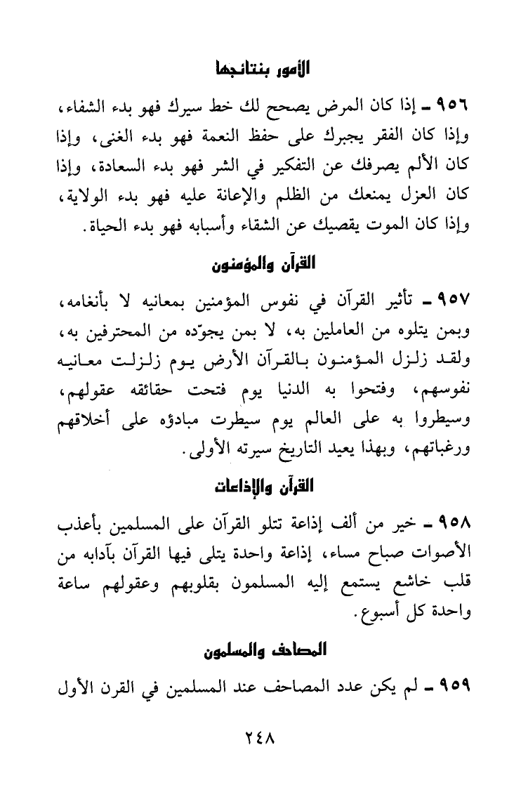 تأثير القرآن في نفوس المؤمنين بمعانيه لا بأنغامه، وبمن يتلوه من العاملين به لا بمن يجوده من المحترفين به، ولقد زلزل المؤمنون بالقرآن الأرض يوم زلزلت معانيه نفوسهم، وفتحوا به الدنيا يوم فتحت حقائقه عقولهم، وسيطروا به على العالم يوم سيطرت مبادئه على أخلاقهم ورغباتهم، وبهذا يعيد التاريخ سيرته الأولى.