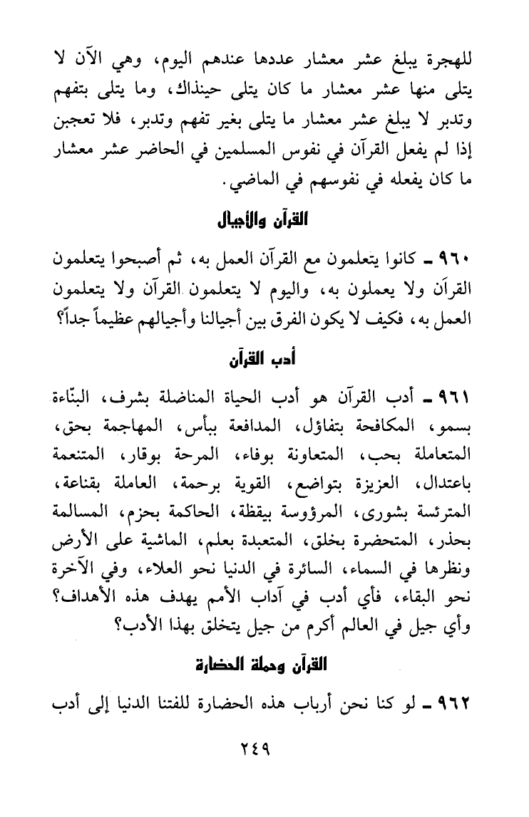 أدب القرآن هو أدب الحياة المناضلة بشرف، البناءة بسمو، المكافحة بتفاؤل، المدافعة ببأس، المهاجمة بحق، المتعاملة بحب، المتعاونة بوفاء، المرحة بوقار، المتنعمة باعتدال، العزيزة بتواضع، القوية برحمة، العاملة بقناعة، المترئسة بشورى، المرؤوسة بيقظة، الحاكمة بحزم، المسالمة بحذر، المتحضرة بخلق، المتعبدة بعلم، الماشية على الأرض ونظرها في السماء، السائرة في الدنيا نحو العلاء، وفي الآخرة نحوالبقاء، فأي أدب في آداب الأمم يهدف هذه الأهداف؟ وأي جيل في العالم أكرم من جيل يتخلق بهذا الأدب؟
