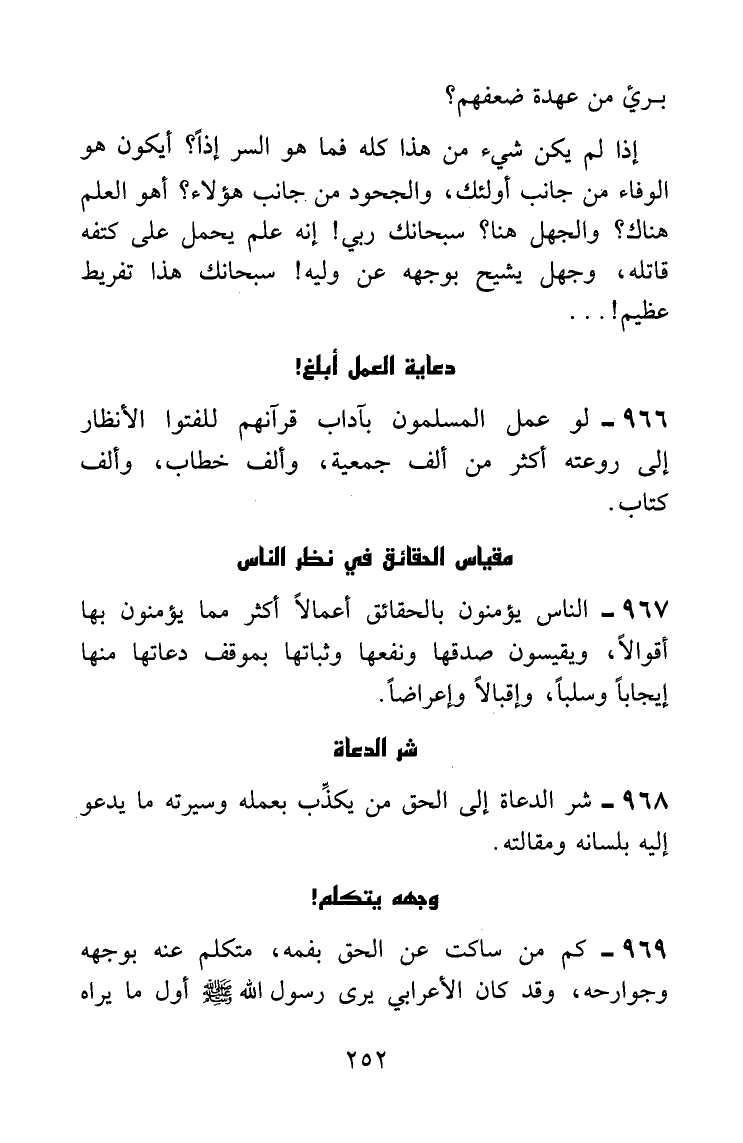 الناس يؤمنون بالحقائق أعمالاً أكثر مما يؤمنون بها أقوالاً، ويقيسون صدقها ونفعها وثباتها بموقف دعاتها منها إيجاباً وسلباً، وإقبالاً وإعراضاً.