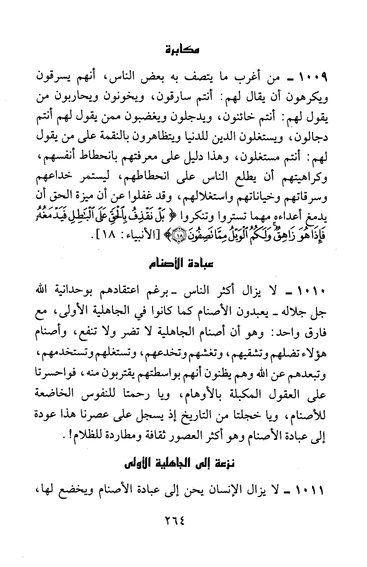 لا يزال أكثر الناس - بالرغم من اعتقادهم بوحدانية الله جل جلاله - يعبدون الأصنام كما كانوا في الجاهلية الأولى، مع فارق واحد هو: أن أصنام الجاهلية لا تضر ولا تنفع، وأصنام هؤلاء تضلهم وتشقيهم، وتغشهم وتخدعهم، وتستغلهم وتستخدمهم، وتبعدهم عن الله وهم يظنون أنهم بواسطتهم يقتربون منه، فواحسرتا على العقول المكبلة بالأوهام، ويا رحمتا للنفوس الخاضعة للأصنام، ويا خجلتا من التاريخ إذ يسجل على عصرنا هذا عودة إلى عبادة الأصنام وهو أكثر العصور ثقافة ومطاردة للظلام!.
