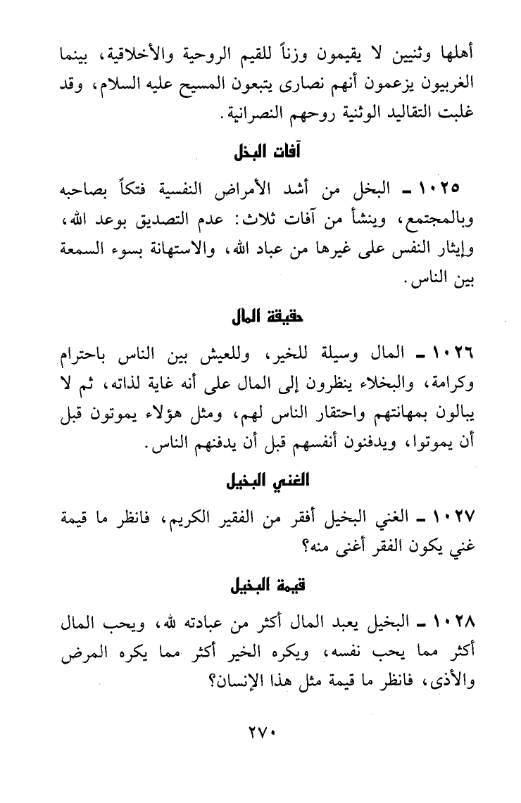 البخيل يعبد المال أكثر من عبادته لله، ويحب المال أكثر مما يحب نفسه، ويكره الخير أكثر مما يكره المرض والأذى، فانظر ما قيمة مثل هذا الإنسان؟