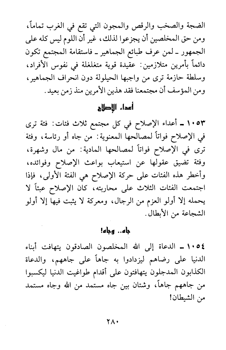الضجة والصخب والرقص والمجون التي تقع في الغرب تماماً، ومن حق المخلصين أن يجزعوا لذلك، غير أن اللوم ليس كله على الجمهور - لمن عرف طبائع الجماهير - فاستقامة المجتمع تكون دائماً بأمرين متلازمين: عقيدة قوية متغلغلة في نفوس الأفراد، وسلطة حازمة ترى من واجبها الحيلولة دون انحراف الجماهير، ومن المؤسف أن مجتمعنا فقد هذين الأمرين منذ زمن بعيد.