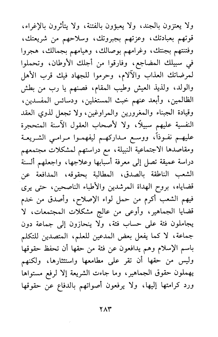 ولا يعتزون بالجند، ولا يعبأون بالفتنة، ولا يتأثرون بالإغراء، قوتهم بعبادتك، وعزتهم بجبروتك، وسلاحهم من شريعتك، وفتنتهم بجنتك، وغرامهم بوصالك، وهيامهم بجمالك، هجروا في سبيلك المضاجع، وفارقوا من أجلك الأوطان، وتحملوا لمرضاتك العذاب والآلام، وحرموا للجهاد فيك قرب الأهل والولد، ولذيذ العيش وطيب المقام، فصنهم يا رب من بطش الظالمين، وأبعد عنهم خبث المستغلين، ودسائس المفسدين، وقيادة الجبناء والمغرورين والمراوغين، ولا تجعل لذوي العقد النفسية عليهم سبيلاً، ولا لأصحاب العقول الآسنة المتحجرة عليهم نفوذاً، ووسع مداركهم ليفهموا مرامي الشريعة ومقاصدها الاجتماعية النبيلة، مع دراستهم لمشكلات مجتمعهم دراسة عميقة تصل إلى معرفة أسبابها وعلاجها، واجعلهم ألسنة الشعب الناطقة بالصدق، المطالبة بحقوقه، المدافعة عن قضاياه، بروح الهداة المرشدين، والأطباء الناصحين؛ حتى يرى فيهم الشعب أكرم من حمل لواء الإصلاح، وأصدق من خدم قضايا الجماهير، وأوعى من عالج مشكلات المجتمعات، لا يجاملون فئة على حساب فئة، ولا ينحازون إلى جماعة دون جماعة، لا كما يفعل بعض المدعين للعلم، المتصدين للتكلم باسم الإسلام وهم يدافعون عن فئة من حقها أن تحفظ حقوقها وليس من حقها أن تقر مطامعها واستئثارها، ولكنهم يهملون حقوق الجماهير، وما جاءت الشريعة إلا لرفع مستواها ورد كرامتها إليها، ولا يرفعون أصواتهم بالدفاع عن حقوقها