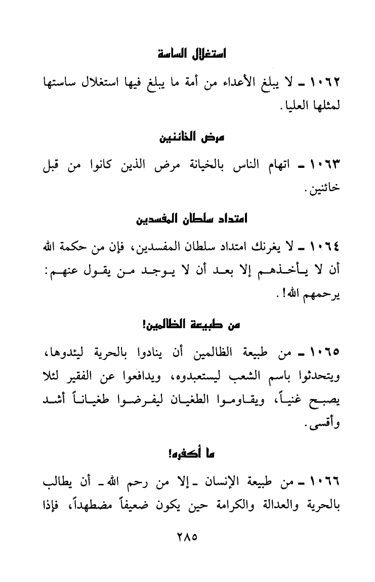 من طبيعة الظالمين أن ينادوا بالحرية ليئدوها، ويتحدثوا باسم الشعب ليستعبدوه، ويدافعوا عن الفقير لئلا يصبح غنيًّا، ويقاوموا الطغيان ليفرضوا طغياناً أشد وأقسى.