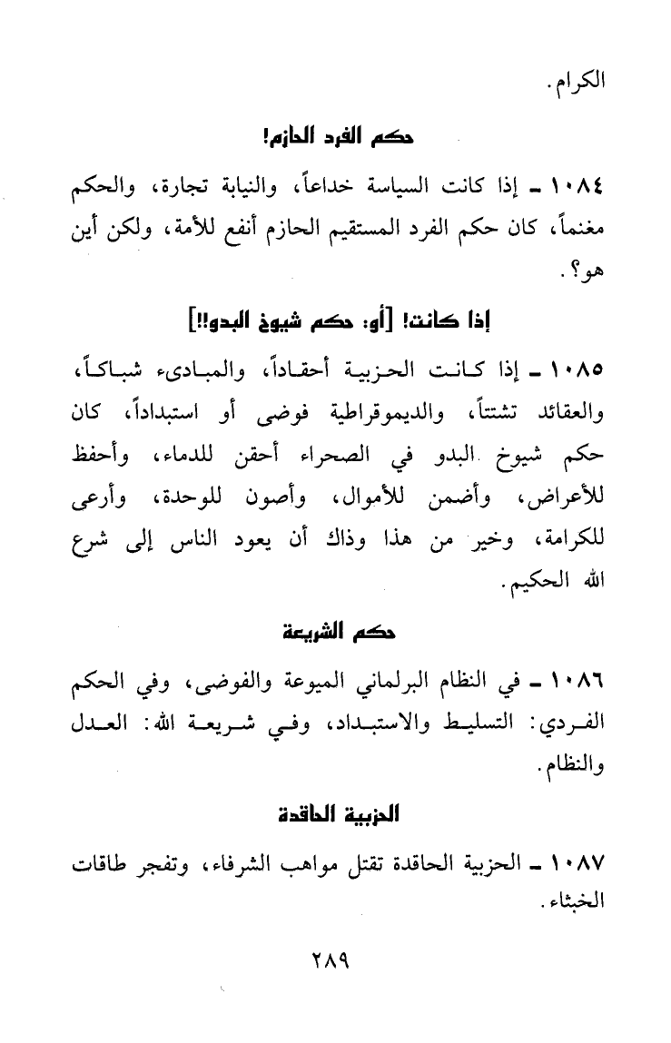 إذا كانت الحزبية أحقاداً، والمبادئ شباكاً، والعقائد تشتتاً، والديموقراطية فوضى أو استبداداً، كان حكم شيوخ البدو في الصحراء أحقن للدماء، وأحفظ للأعراض، وأضمن للأموال، وأصون للوحدة، وأرعى للكرامة، وخير من هذا وذاك: أن يعود الناس إلى شرع الله الحكيم.