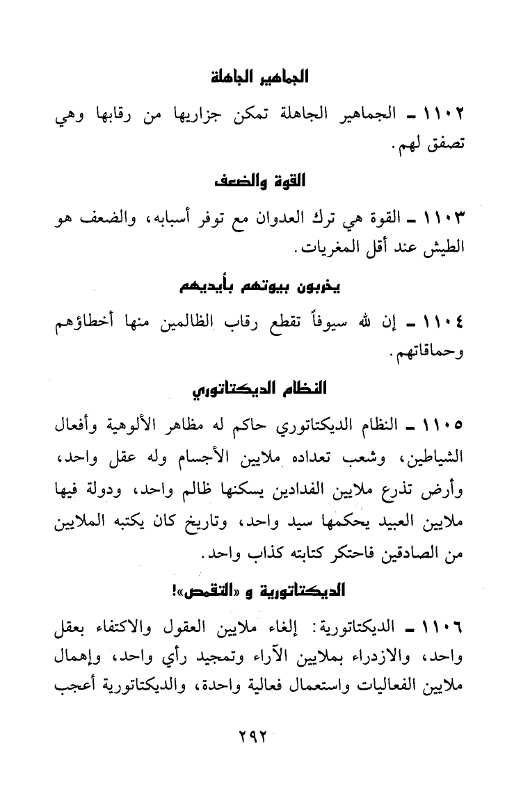 النظام الديكتاتوري حاكم له مظاهر الألوهية وأفعال الشياطين، وشعب تعداده ملايين الأجسام وله عقل واحد، وأرض تذرع ملايين الفدادين يسكنها ظالم واحد، ودولة فيها ملايين العبيد يحكمها سيد واحد، وتاريخ كان يكتبه الملايين من الصادقين فاحتكر كتابته كذاب واحد.