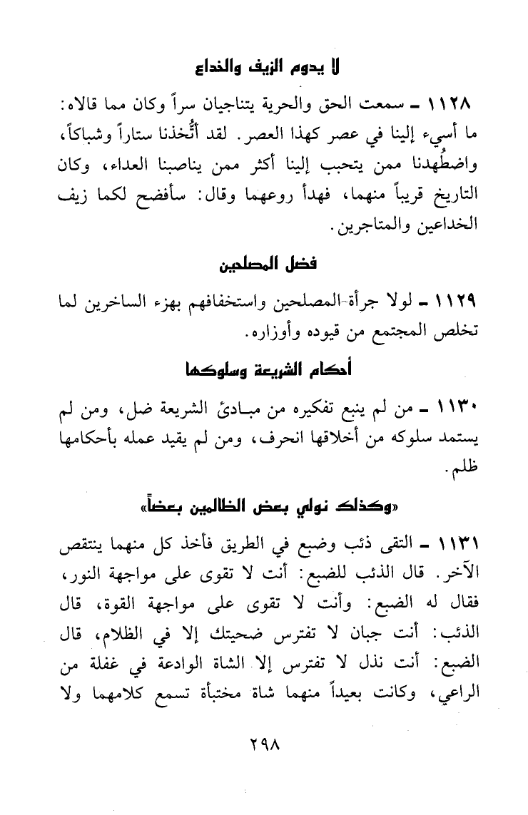 سمعت الحق والحرية يتناجيان سرًّا وكان مما قالاه: ما أسيء إلينا في عصر كهذا العصر؛ لقد اتخذنا ستاراً وشباكاً، واضطهدنا ممن يتحبب إلينا أكثر ممن يناصبنا العداء، وكان التاريخ قريباً منهما، فهدأ روعهما وقال: سأفضح لكما زيف الخداعين والمتاجرين.