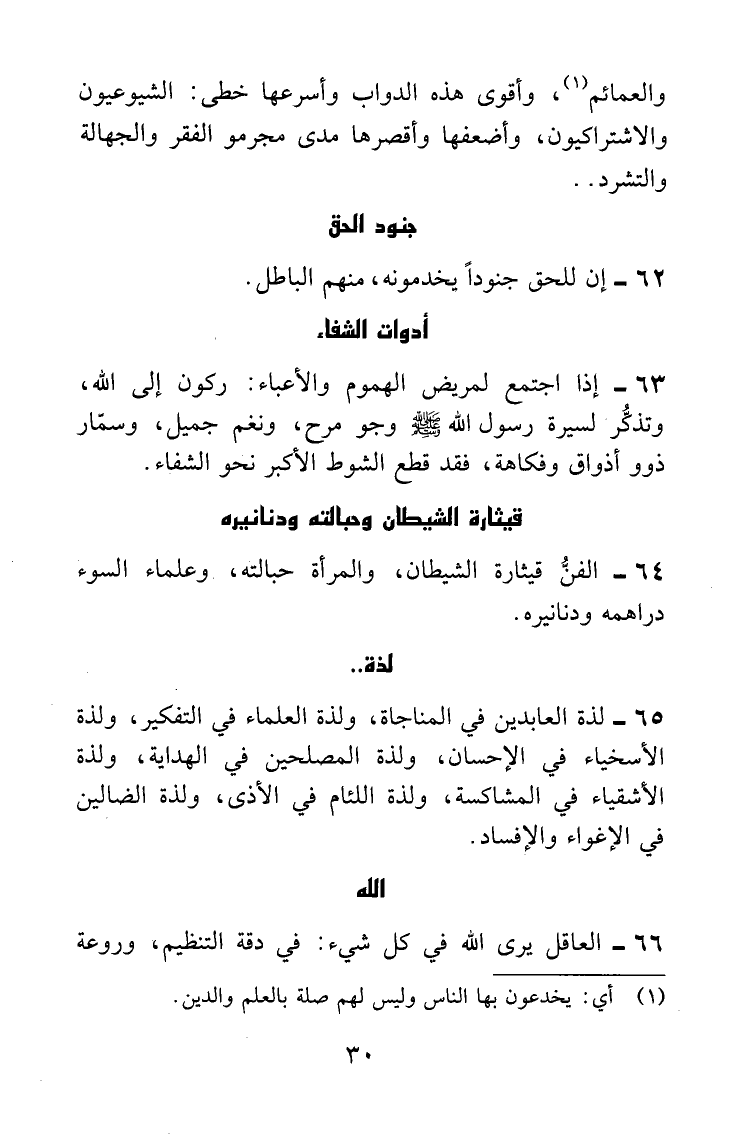 لذة العابدين في المناجاة، ولذة العلماء في التفكير، ولذة الأسخياء في الإحسان، ولذة المصلحين في الهداية، ولذة الأشقياء في المشاكسة، ولذة اللئام في الأذى، ولذة الضالين في الإغواء والإفساد.