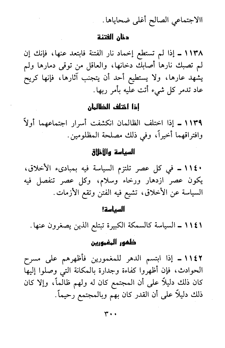 في كل عصر تلتزم السياسة فيه بمبادئ الأخلاق، يكون عصر ازدهار ورخاء وسلام، وكل عصر تنفصل فيه السياسة عن الأخلاق، تشيع فيه الفتن وتقع الأزمات.