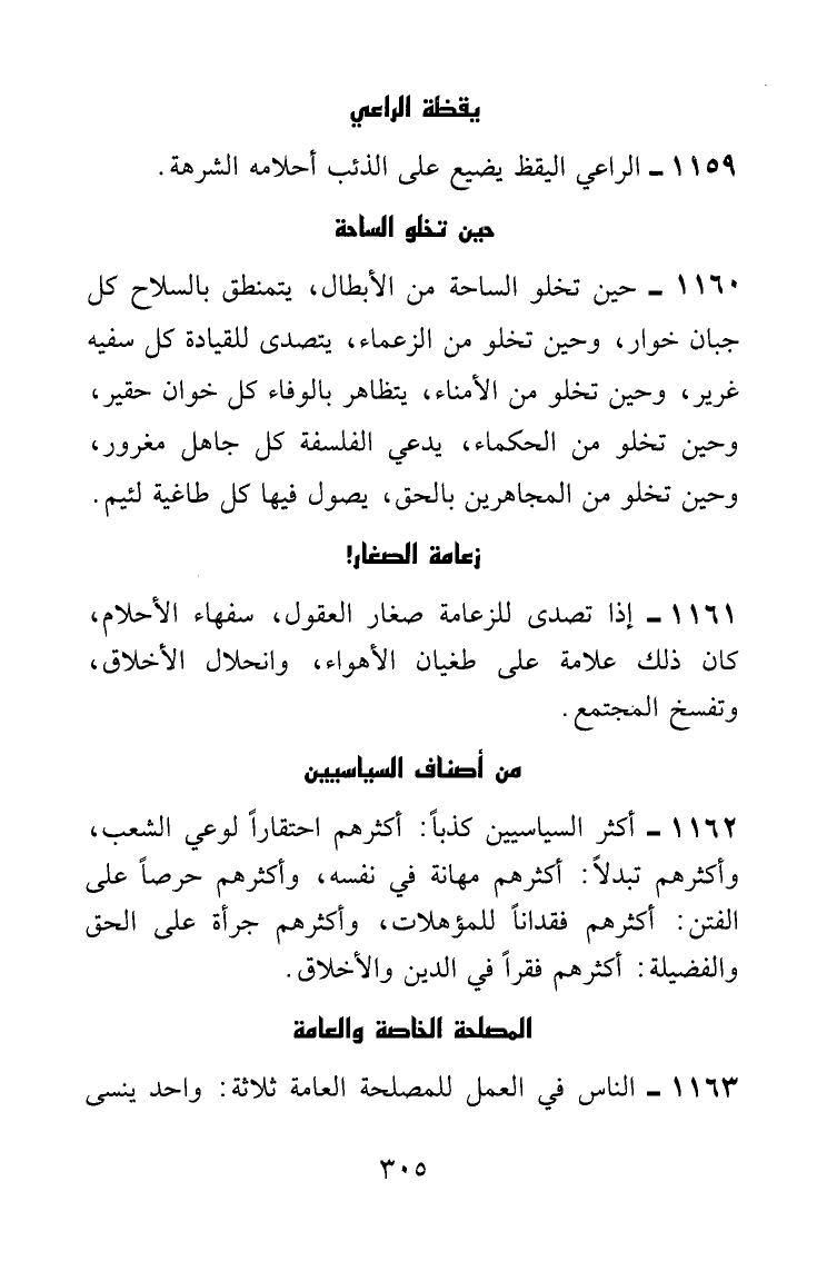 حين تخلو الساحة من الأبطال: يتمنطق بالسلاح كل جبان خوار، وحين تخلو من الزعماء: يتصدى للقيادة كل سفيه غرير، وحين تخلو من الأمناء: يتظاهر بالوفاء كل خوان حقير، وحين تخلو من الحكماء: يدعي الفلسفة كل جاهل مغرور، وحين تخلو من المجاهرين بالحق: يصول فيها كل طاغية لئيم.