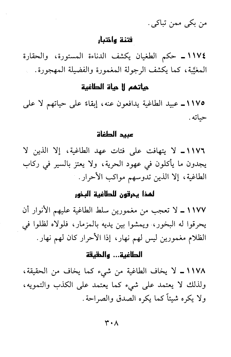 لا تعجب من مغمورين سلط الطاغية عليهم الأنوار أن يحرقوا له البخور، ويمشوا بين يديه بالمزمار؛ فلولاه لظلوا في الظلام مغمورين ليس لهم نهار، إذا الأحرار كان لهم نهار.