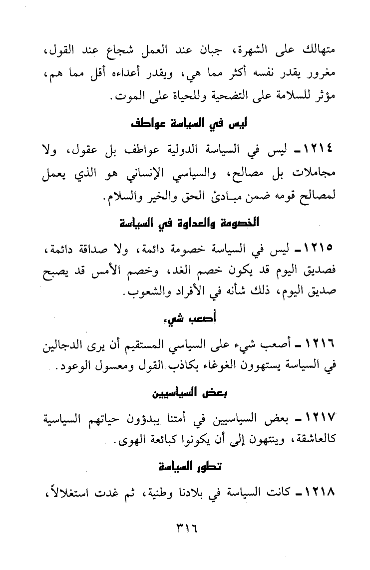 ليس في السياسة الدولية عواطف بل عقول، ولا مجاملات بل مصالح، والسياسي الإنساني هو الذي يعمل لمصالح قومه ضمن مبادئ الحق والخير والسلام.