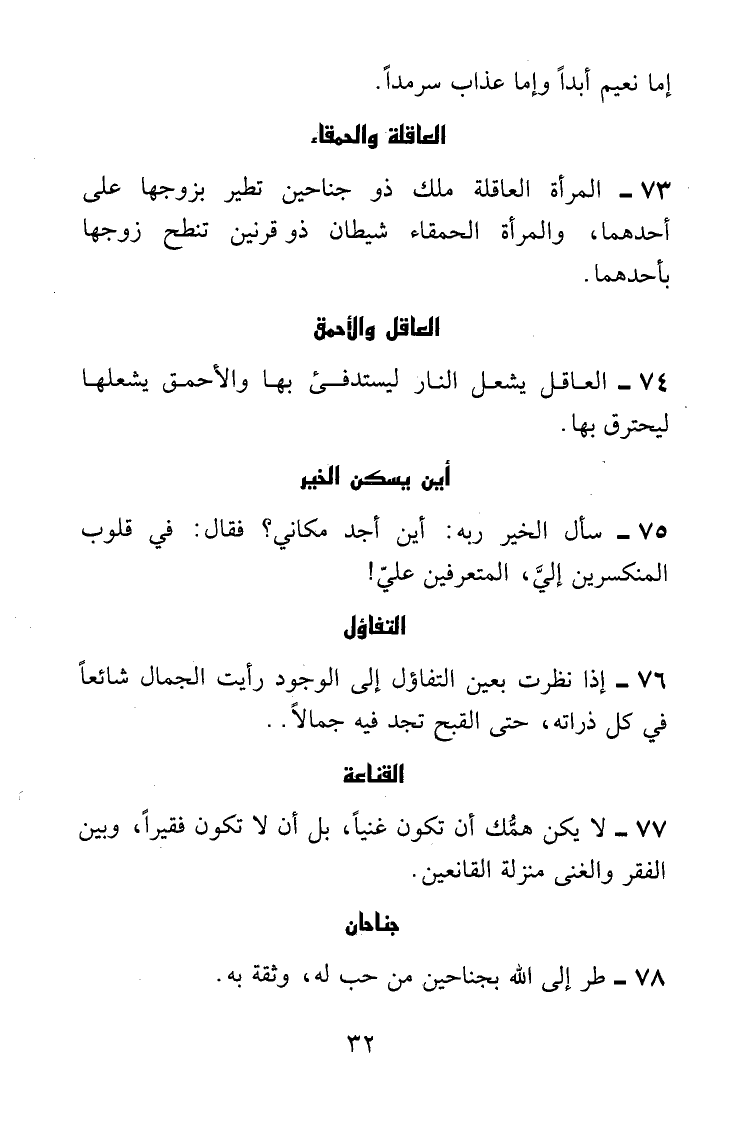 المرأة العاقلة ملك ذو جناحين تطير بزوجها على أحدهما، والمرأة الحمقاء شيطان ذو قرنين تنطح زوجها بأحدهما.