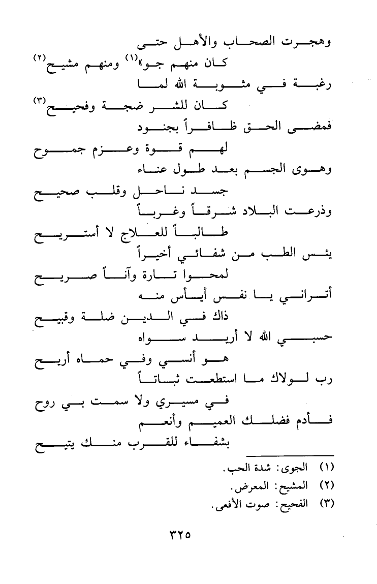 وهجرت الأصحاب والأهل حتى ... كان منهم جوى (¬1) ومنهم مشيح (¬2)